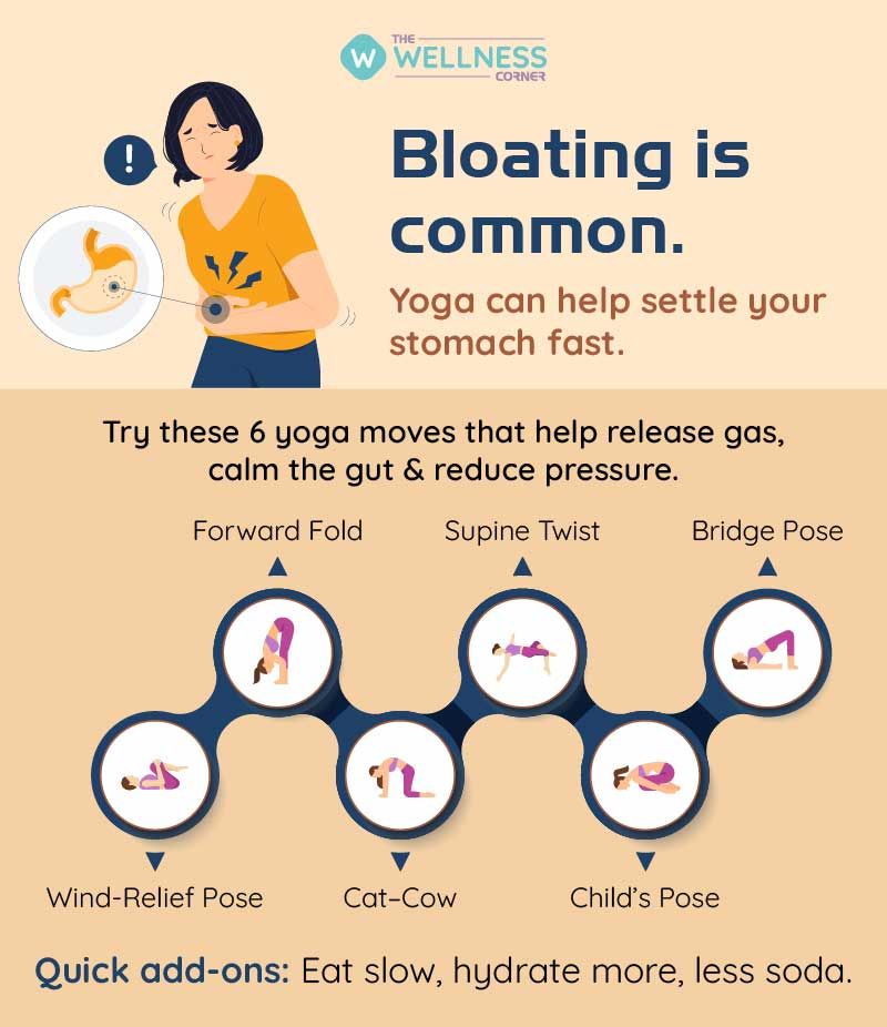 While dietary adjustments, hydration, and mindful eating can help, yoga offers a natural way to relieve bloating by massaging internal organs, improving circulation, and promoting relaxation.