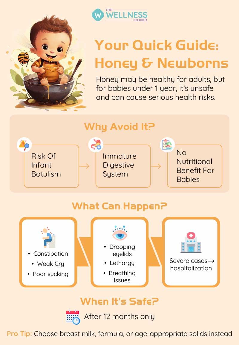 A newborn’s digestive system is still very delicate and immature. While adults can digest honey easily, babies cannot. Their intestines are still developing and cannot handle the bacterial spores found in honey. Even a tiny lick of honey on a spoon or pacifier is unsafe.