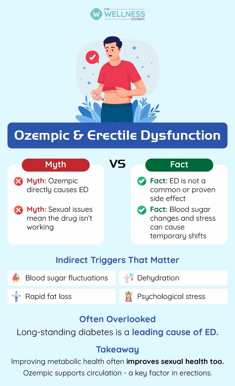 Current scientific evidence does not show that Ozempic directly causes erectile dysfunction. ED has not been identified as a common or consistent side effect of the medication. Most clinical studies have not reported a link between GLP-1 drugs and impaired sexual performance.