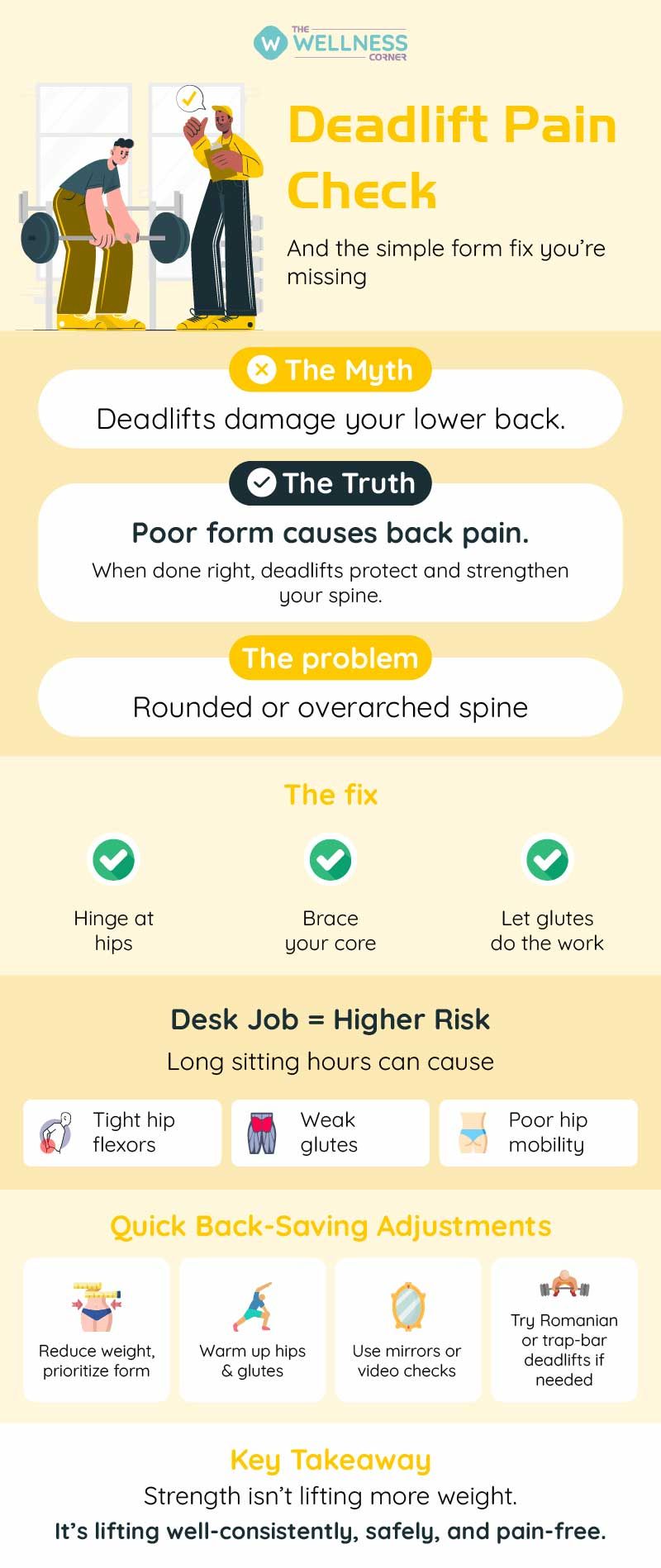 If your lower back aches after deadlifts, you are not alone. This discomfort is one of the most common complaints among gym goers, office professionals, and even experienced lifters. The good news is that in most cases, the pain is not caused by the exercise itself. It is caused by a small but critical form mistake that often goes unnoticed.