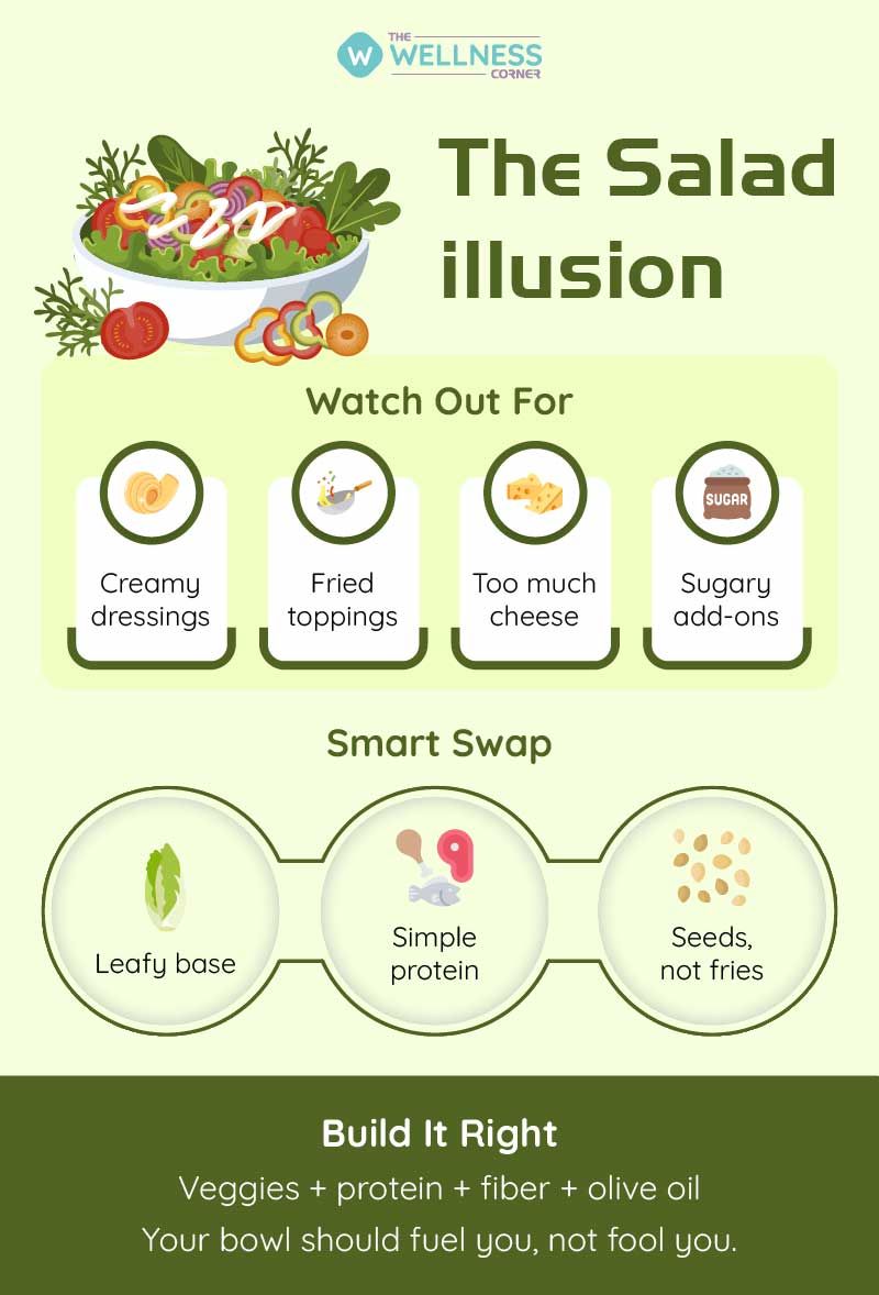 Salads can be wonderful for your health, when made right. But don’t let clever marketing, sugary dressings, or crunchy toppings trick you into eating a meal that’s no better than fast food.