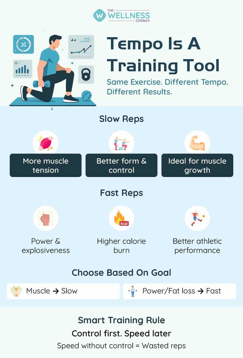 Tip: Mix both tempos in your training cycle. Slow reps can improve control and muscle activation, while fast reps can build power and agility. The combination gives you a well-rounded, adaptable body.