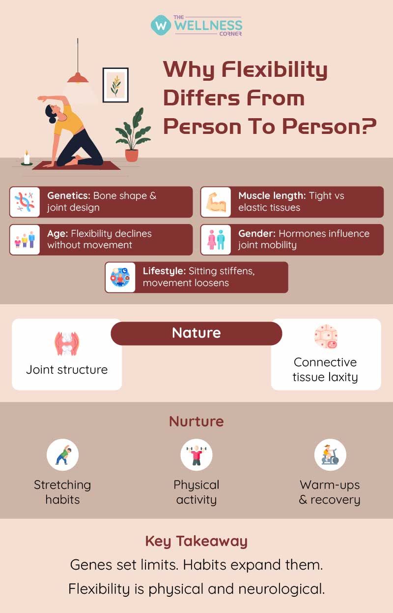 Your genetic makeup strongly influences your natural flexibility and range of motion. The design of your bones and joints can make certain movements easier or harder.