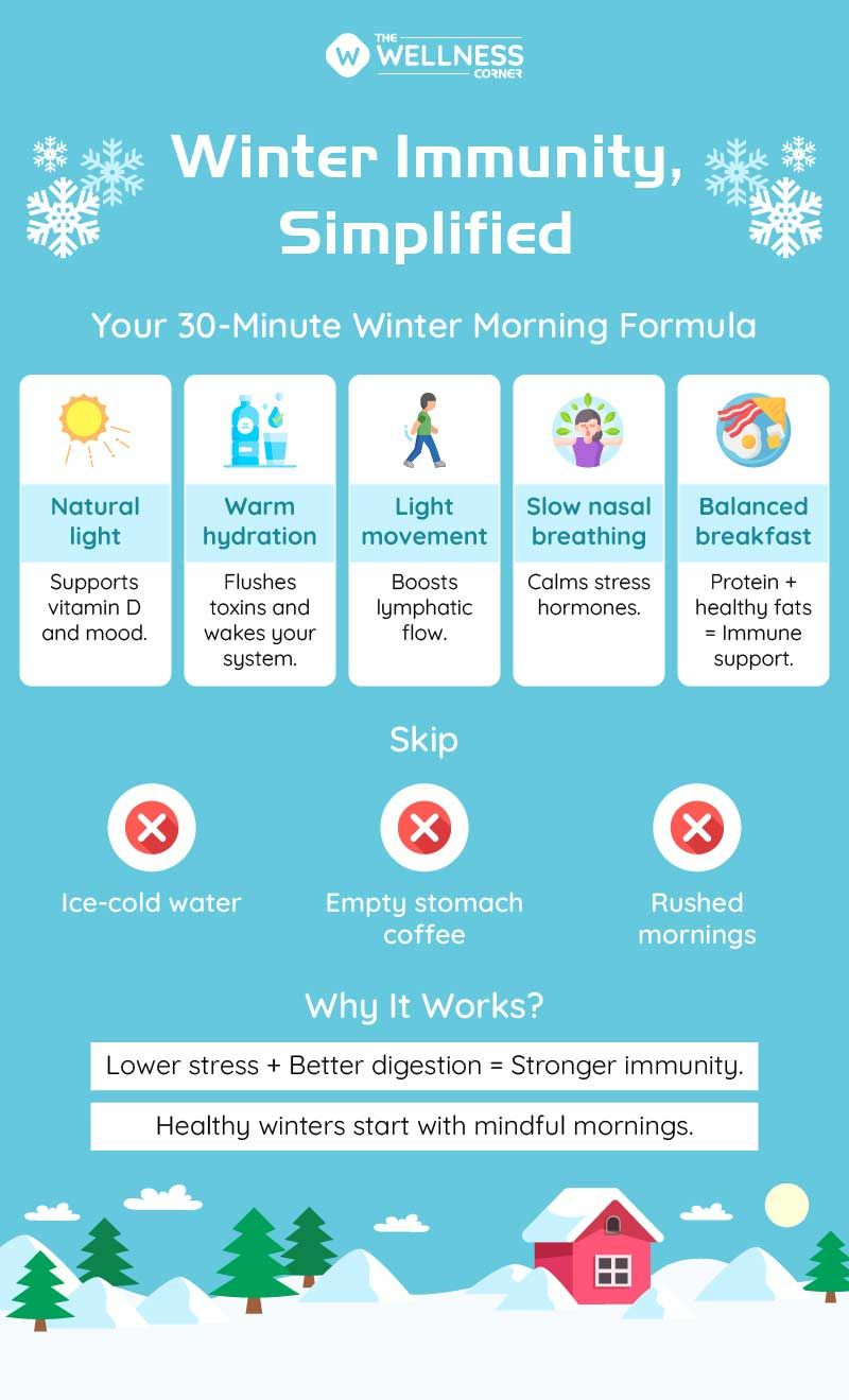 Winter puts extra pressure on your immune system. Reduced sunlight affects vitamin D levels, cold air dries out nasal passages, and indoor living increases exposure to viruses. Your morning habits influence hormone balance, inflammation levels, digestion, and immune cell activity.
